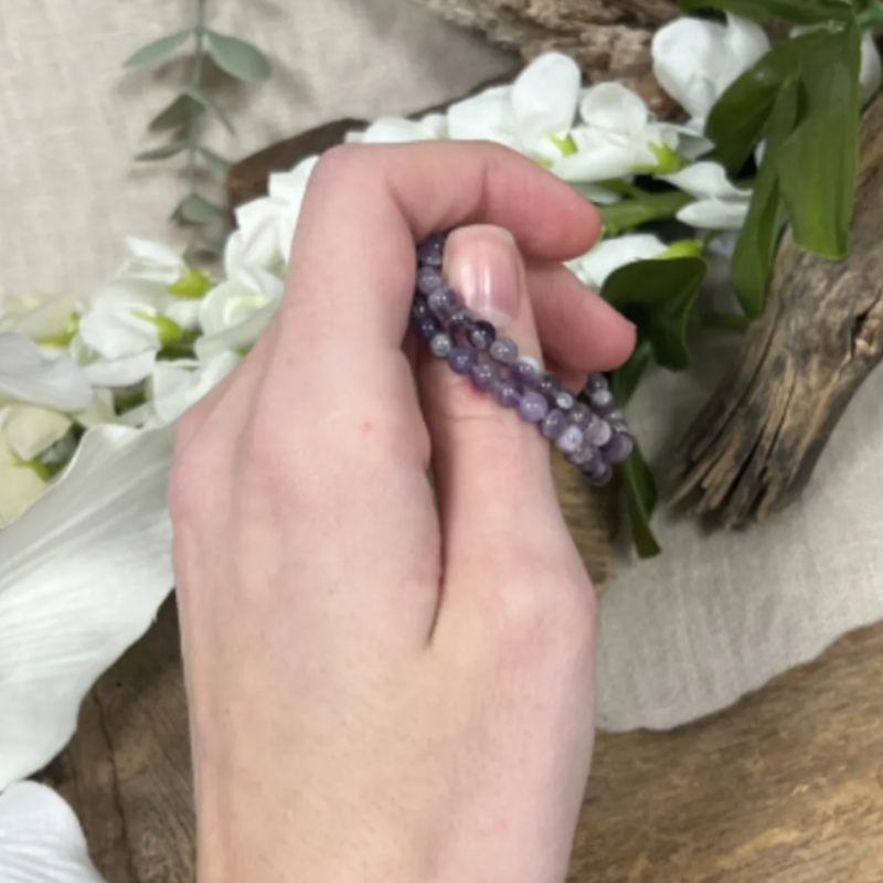 Een kralenarmbandje van 16 cm lang met 4 mm kralen van de half-edelsteen Amethist, geregen op elastiek.